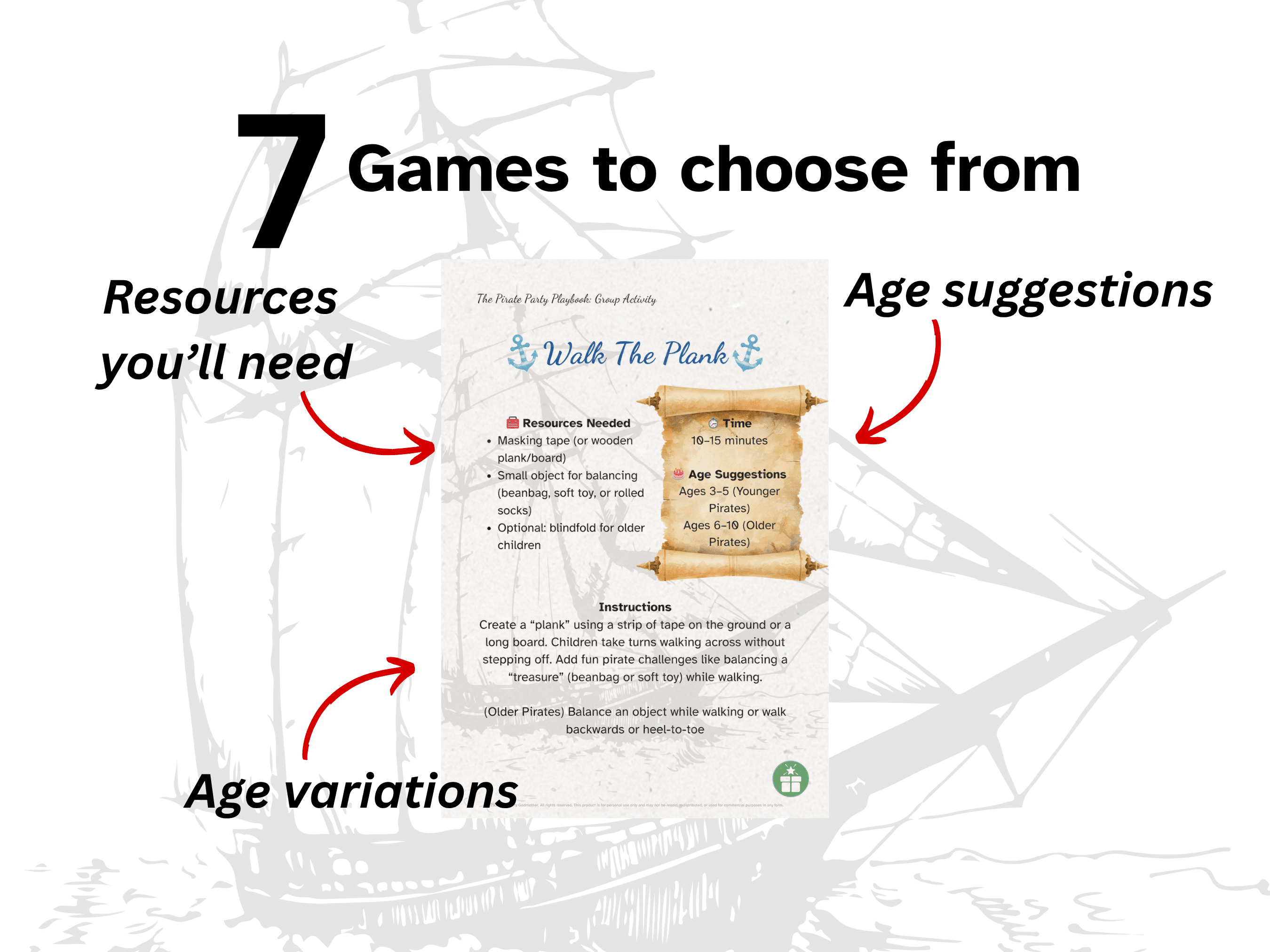 • 🏴‍☠️ Legendary Games: Step-by-step instructions for ‘Walk the Plank,’ ‘What’s Your Pirate Name?’, ‘Pirate Hook Toss’, ‘Treasure Dig,’ and ‘Captain Says.’